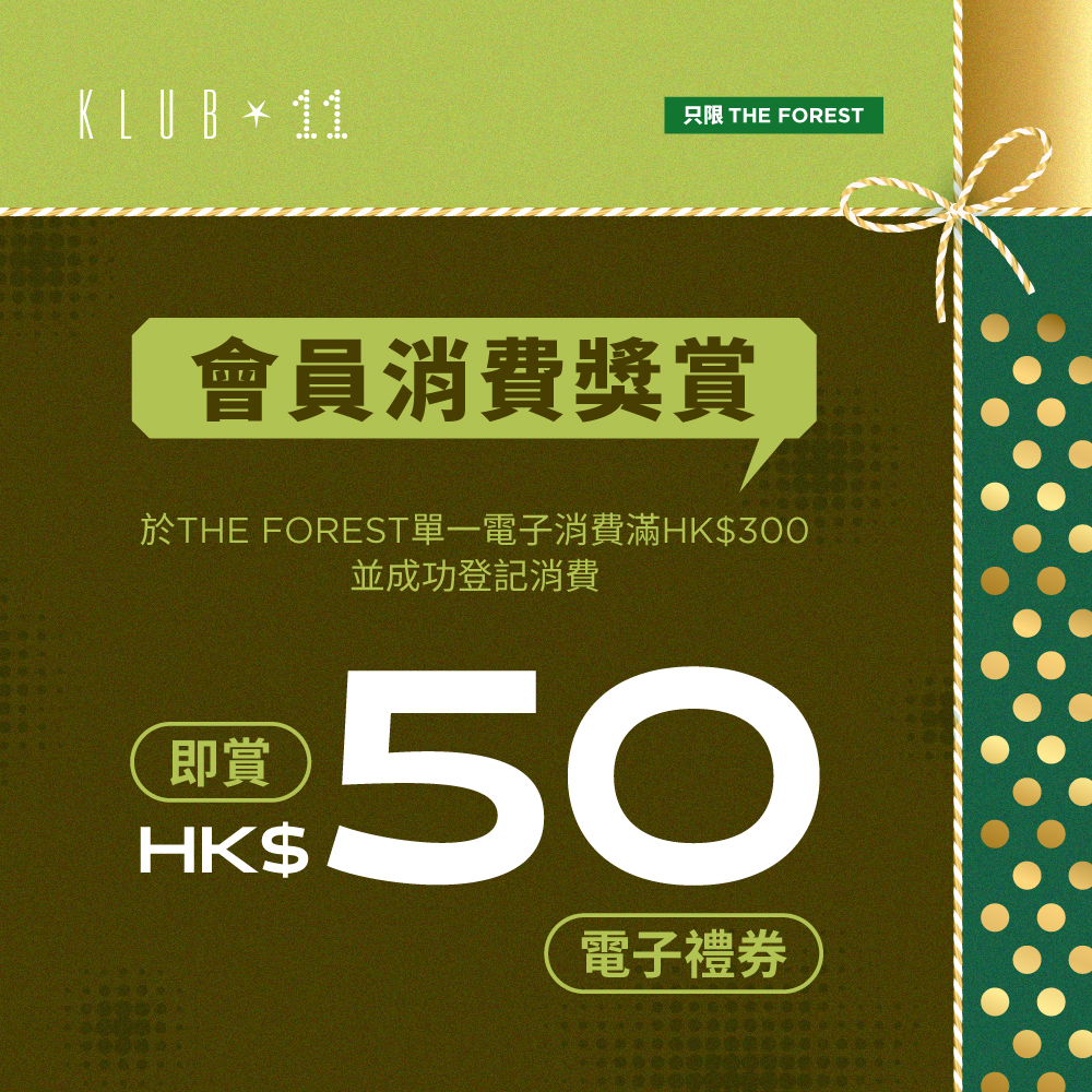 18/12/2025 - 28/02/2026From 18 December 2025 to 28 February 2026, enjoy Member Spending Reward in HK$50 e-Voucher rewards Every Day upon HK$300 or above single electronic spending at THE FOREST!
