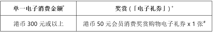 指定零售商户港币50元会员消费奖赏购物电子礼券(消费满 HK$150 即可使用)